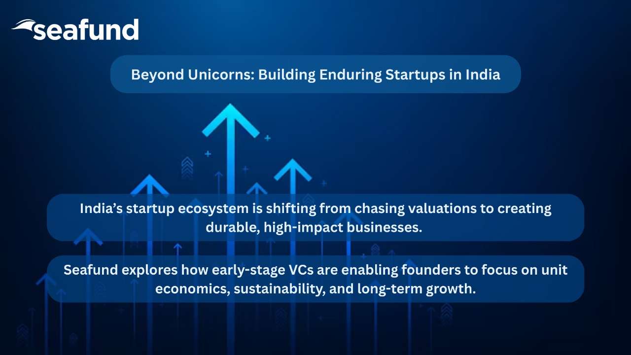 In recent years, the narrative around funding for startups in India has often gravitated toward unicorn‑chasing: billion‑dollar valuations, mega‑rounds, and rapid scale. But today’s market dynamics are shifting. Investors and founders alike are placing increasing emphasis on unit economics, sustainable growth and durable business models. For venture capital firms, especially those backing early stage ventures, this transition is not just a trend, but a strategic inflection point. At Seafund, our perspective centres on building enduring startups — not just the next “one‑day” unicorn, but companies that thrive over the long term.